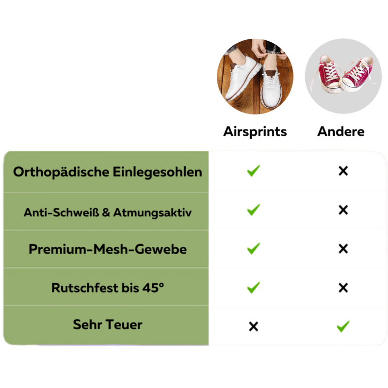 Hinterlassen Sie bei Geschäftsveranstaltungen, Meetings und Freizeit einen bleibenden Eindruck und genießen Sie den unvergleichbaren Komfort und die Premium-Qualität unserer sportlichen hochwertigen Sneaker den ganzen Tag. Vergessen Sie müde und schmerzende Füße – unsere AirSprints bieten Ihnen den ganzen Tag lang unvergleichlichen Tragekomfort, dank Ihrer einzigartigen ergonomischen Passform.